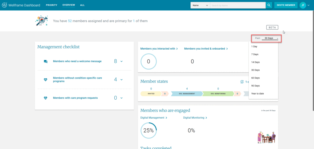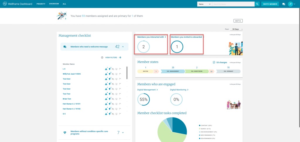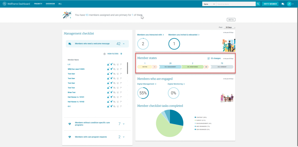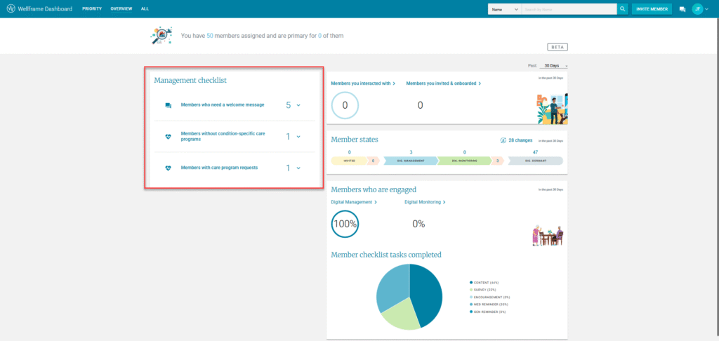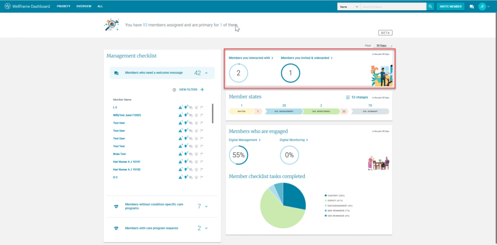 The Overview Page is a tab on the Dashboard that provides actionable insights into a Care Manager’s “Member” panel so they can have full visibility into key insights to help determine next actions to help activate, engage, and progress members on their digital health journey.