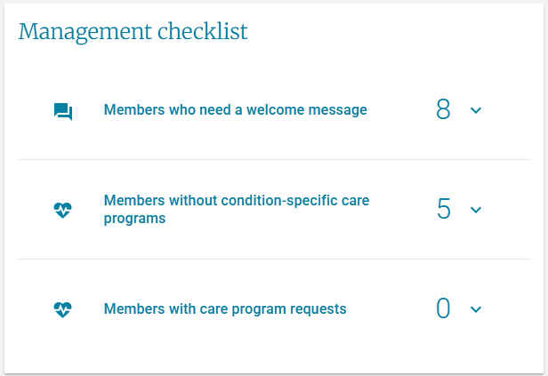 The Management Checklist shows activation recommendations across your digital panel. Activation recommendations are staff actions that help personalize the member’s digital experience and drive member engagement. The Management Checklist shows current recommendations–it is not impacted by the date filter.