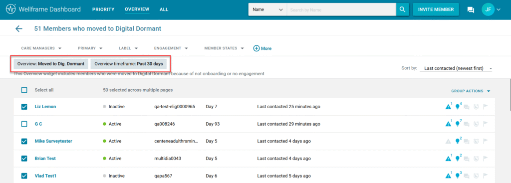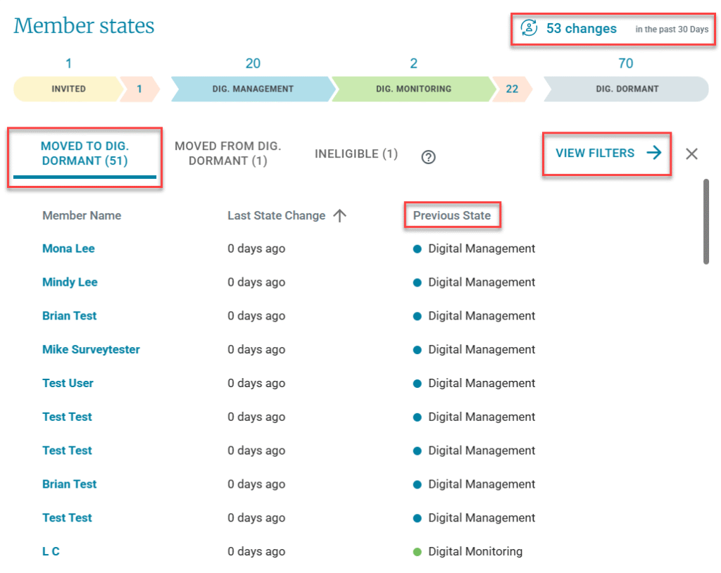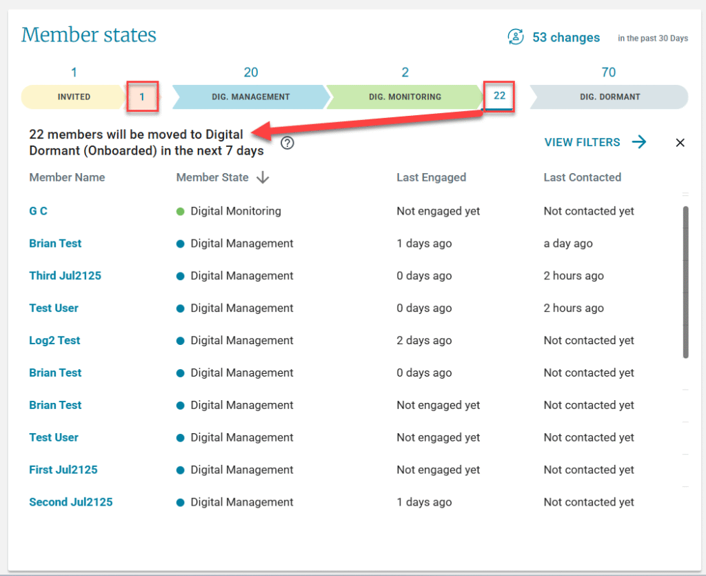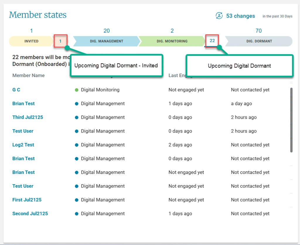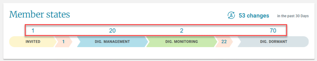 The Invited state and the Digital Management/Digital Monitoring states have an additional number which will show how many of the total members in that state will be moving to Digital Dormant within the next 7 days.